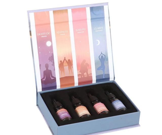 Pause and reset with this Mindfulness collection of ready to use, blended essential oils. The set contains 4 x 10ml bottles with a dropper tool lid, helping to apply just the right amount of oil for each use. The scents you'll discover in this set are: Gratitude - Orange, Kindness - Ginger, Warmth - Cinnamon, Clarity - Chamomile. Natural essential oils pre-diluted with vitis vinifera seed (grape seed) oil. External use only. Avoid contact with eyes. Discontinue use if irritation occurs. Designed by Something Different and part of our exclusive Scent Your Intentions collection of essential oil blends for wellbeing.