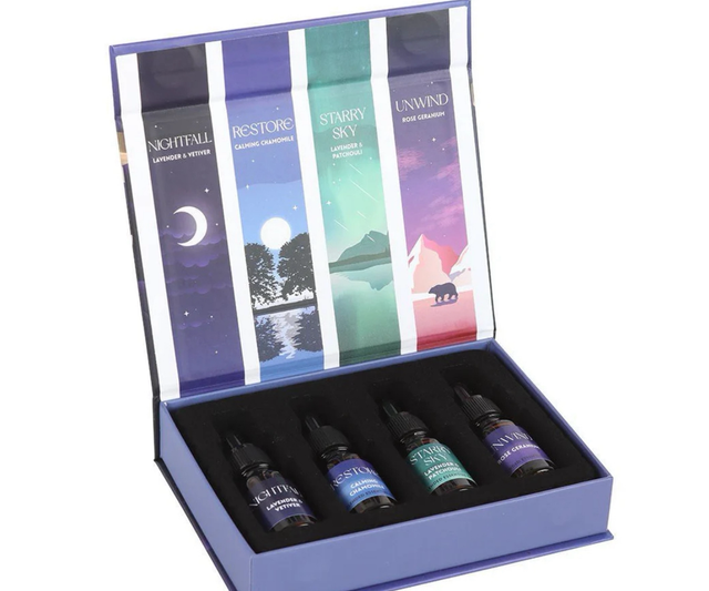 Unwind and relax with this Sleep collection of ready to use, blended essential oils. The set contains 4 x 10ml bottles with a dropper tool lid, helping to apply just the right amount of oil for each use. The scents you'll discover in this set are: Nightfall - Lavender & Vertiver, Restore - Calming Chamomile, Starry Sky - Lavender & Patchouli, Unwind - Rose Geranium. Natural essential oils pre-diluted with vitis vinifera seed (grape seed) oil. External use only. Avoid contact with eyes. Discontinue use if irritation occurs. Designed by Something Different and part of our exclusive Scent Your Intentions collection of essential oil blends for wellbeing.
